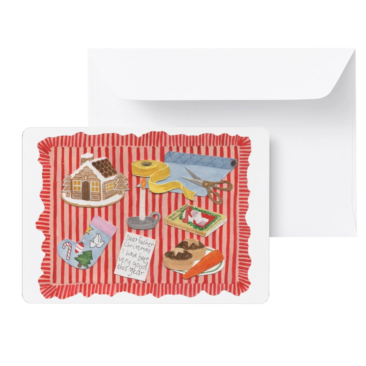 A6 Greetings card, depicting a Christmas Eve tabletop scene. 400gsm paper, tent fold, including C6 envelope. Blank inside.